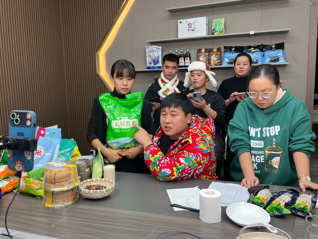 2023年12月15日,卢战开(前排中间)在直播销售大米。(受访者供图)