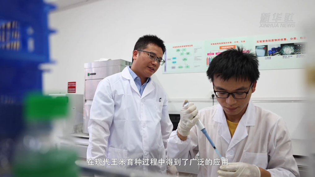 在湖南农业大学农学院的重点实验室内,副教授黄成正在指导学生认真操作实验器皿,对玉米植株叶片进行基因型鉴定,在众多玉米样本中,可以准确、快速地选择具有优质性状的样本,为下一步田间育种试验奠定基础。