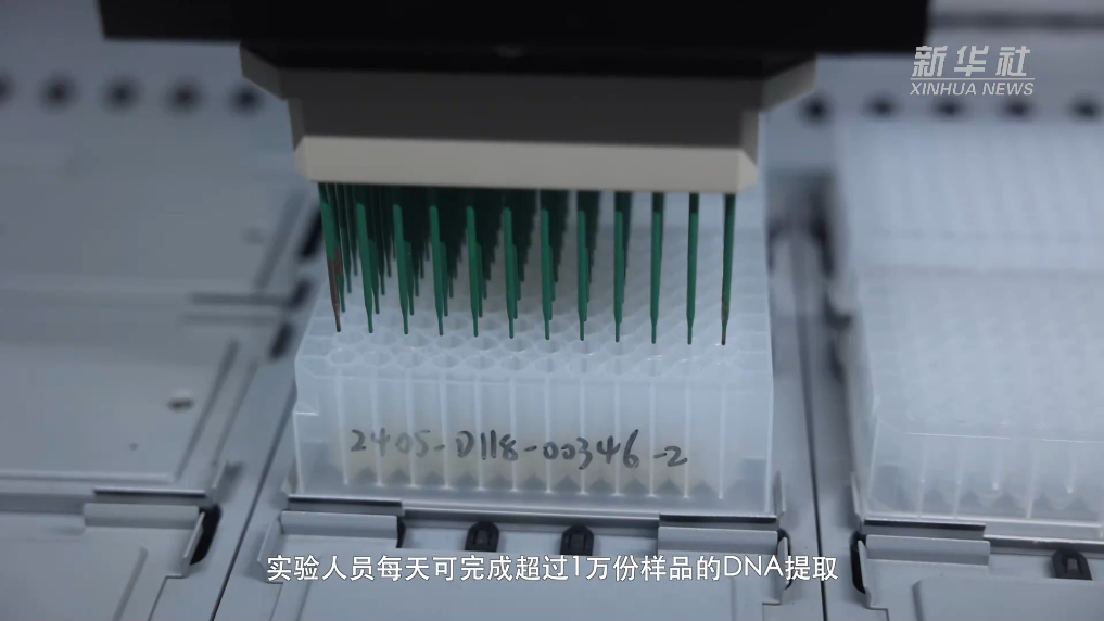 在湖南长沙的岳麓山种业创新中心,分子育种实验室研究员李乐正在把脱壳的水稻种子放进样品盘里,随后将样品放置在全自动移液工作站上,进行样品DNA的提取。