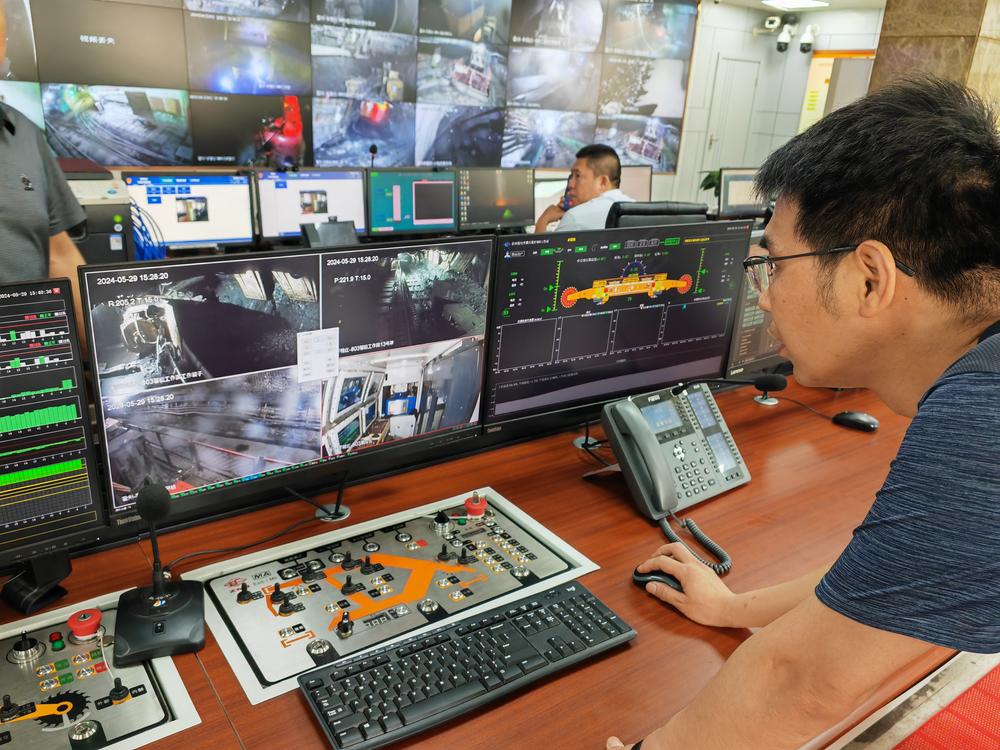 在山西省霍州市的山西焦煤集团李雅庄煤矿,综采队技术员在井上控制井下割煤机(2024年5月29日摄)。新华社记者 王劲玉 摄