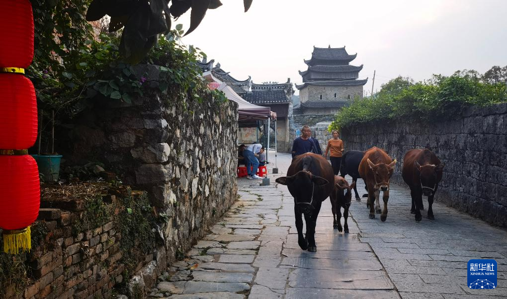11月5日,放牧归来的江永县上甘棠村村民赶牛走过古街。新华社记者 赵众志 摄