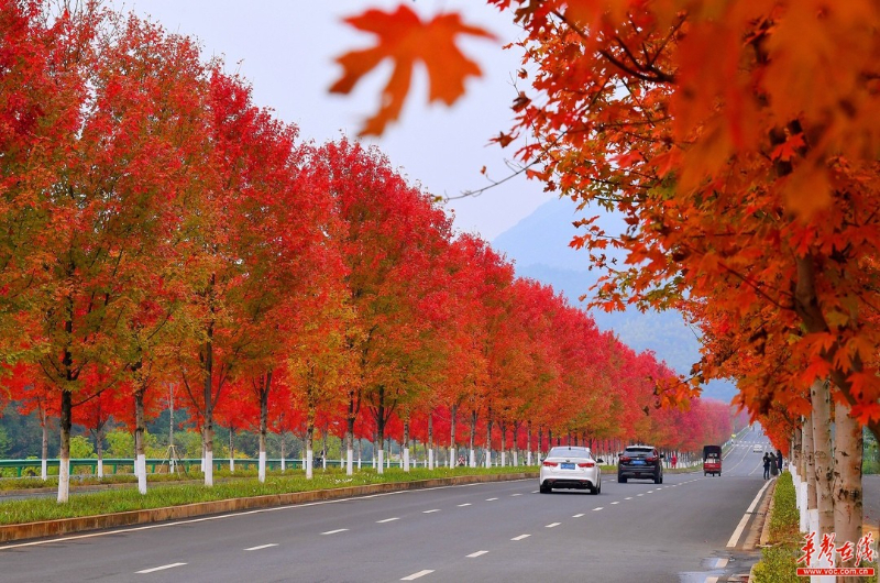 益阳鱼形山东路的“红枫大道”迎来一年最美季节,近6000棵北美红枫换上红装,宛若一团团火焰,沿着山势蜿蜒起伏直到尽头。“红枫大道”全长6.8公里,是鱼形湖风景区主要景观之一,这里的枫叶观赏期可以持续到11月中旬。站在“红枫大道”路边,找好角度,随意按下快门便是一张梦幻美景照。