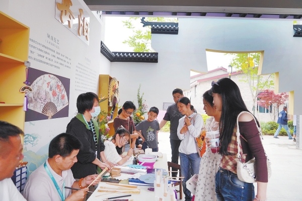 5月24日,第七届湘鄂赣皖非物质文化遗产联展在岳阳市举行。图为观众在了解岳州扇制作技艺。湖南日报全媒体记者 傅聪 摄