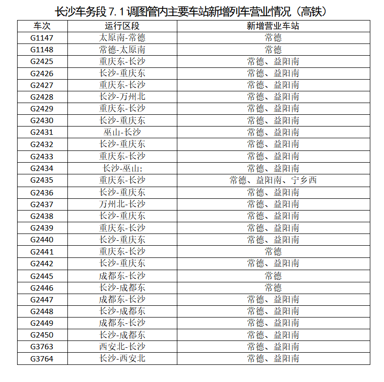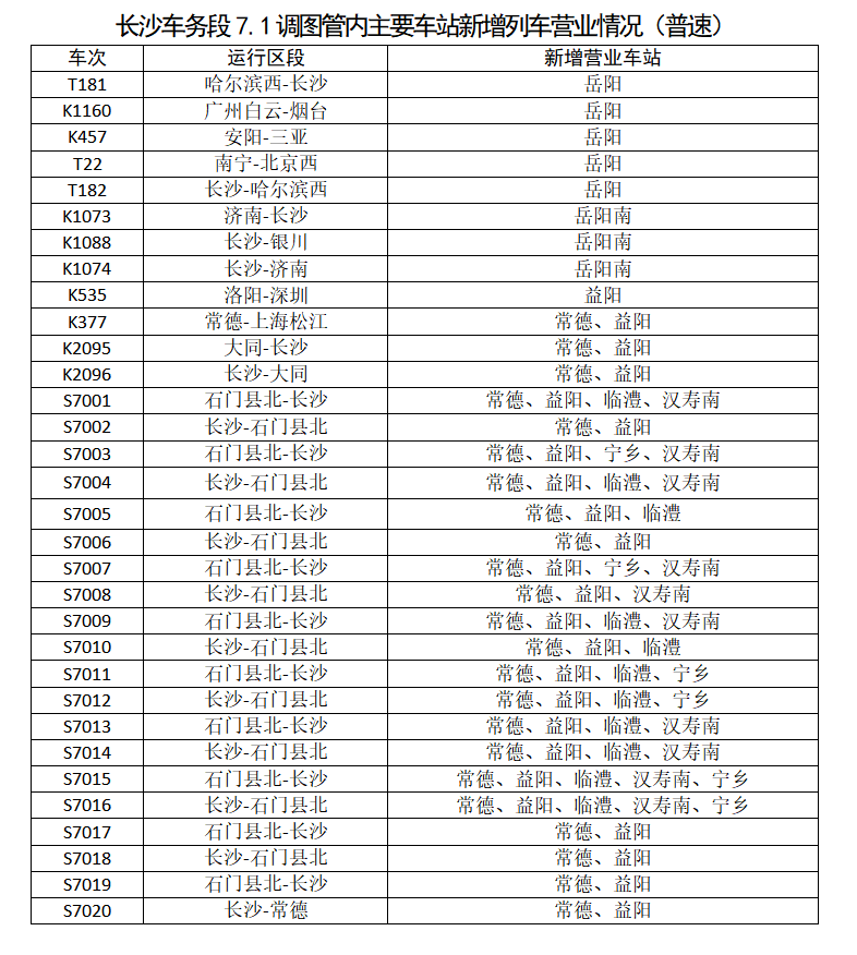 普速列车方面,石门县北、常德至长沙间将增开20趟市域动车组列车,在常德、益阳、汉寿南、宁乡等站办理客运营业;此外,岳阳、岳阳南、常德、益阳等站新增12趟普速列车办理营业,分别前往哈尔滨、南宁、大同、上海等方向。