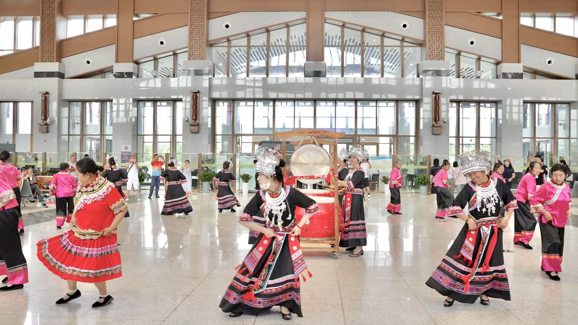 6月18日11时,在渝厦高铁黔常段龙山北站的候车大厅里,一群身着土家族盛装的表演者从旅客中奔跑而出,激昂的鼓点响起,与响亮的锣声交替,奏出铿锵鼓点乐声。头戴银饰的土家姑娘巧笑倩兮,阿婆阿公精神抖擞,踏着鼓点节拍,甩动双臂,旋转跳跃。一场气势磅礴的摆手舞在龙山北站候车大厅快闪,瞬间成为焦点,引得候车旅客纷纷驻足观看。