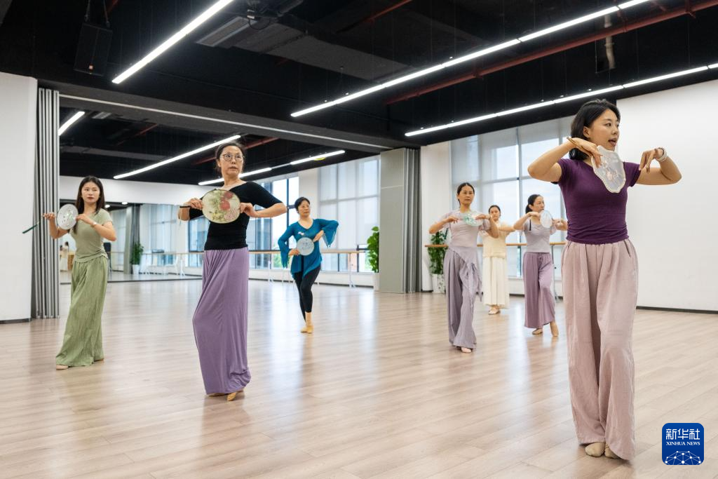 7月9日,在湖南湘江新区文化馆,老师(右一)带领学员练习古典舞。新华社记者 陈思汗 摄pagebreak