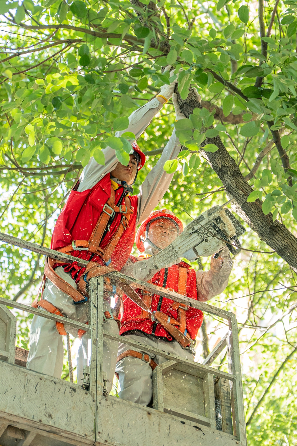 7月4日7:00,国网长沙供电公司输电检修人员对木莲路上危及输电设备安全度夏的行道树开展清理。石磊 摄pagebreak