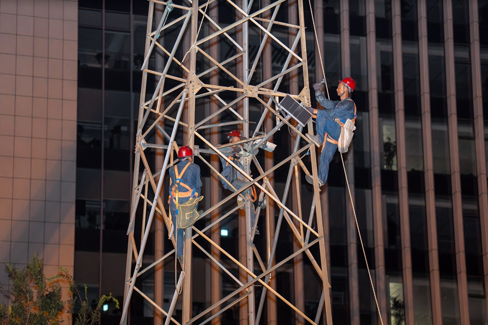 7月2日凌晨1:20,国网长沙供电公司工作人员在铁塔上作业。巫宇龙 摄pagebreak