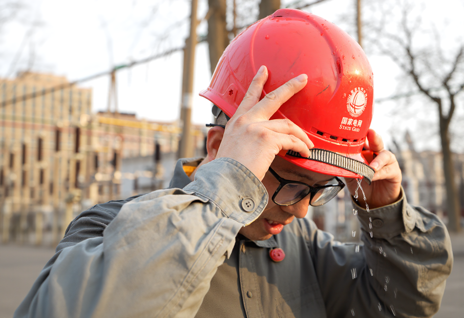 7月8日晚上18:45,变电运维公司工作人员在220千伏树木岭变电站开展特巡后摘下安全帽的瞬间。刘熠扬 摄pagebreak