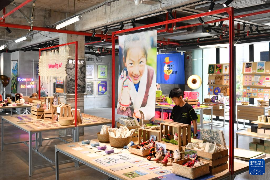7月13日,小朋友在长沙油脂厂艺术商店内挑选商品。新华社记者 陈振海 摄