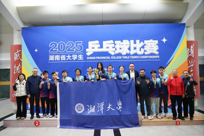 11月17日至23日,2025年湖南省大学生乒乓球比赛在湘潭大学开赛。湘潭大学代表队成功摘得女子团体冠军与混合双打冠军,展现出强劲的竞技实力与良好的精神风貌。