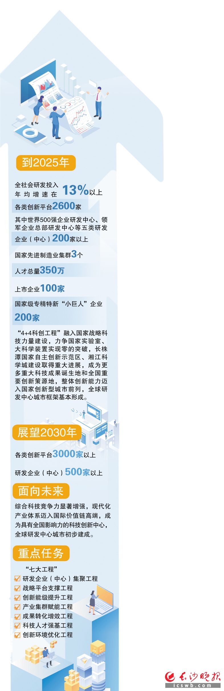 “2025年,全球研发中心城市框架基本形成;2030年,全球研发中心城市初步建成;面向未来,全面建成具有世界影响力的全球研发中心城市。”《实施意见》综合考虑长沙建设全球研发中心城市的基础优势、问题短板、机遇利好等多方面因素,科学提出了阶段性发展目标,并细化到了具体指标。例如,到2025年,全社会研发投入年均增速在13%以上;各类创新平台2600家,其中世界500强企业研发中心、领军企业总部研发中心等五类研发企业(中心)200家以上;国家先进制造业集群3个,国家级专精特新“小巨人”企业200家等。