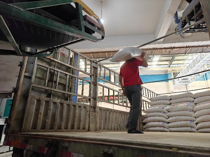 自动传输带架在一台大货车的货厢上,几名工人娴熟配合,把一袋袋大米卸下垒好……在位于湖南省益阳市赫山区的兰溪米市,刚刚上市的新粮经过加工包装后,从这里运往全国各地。