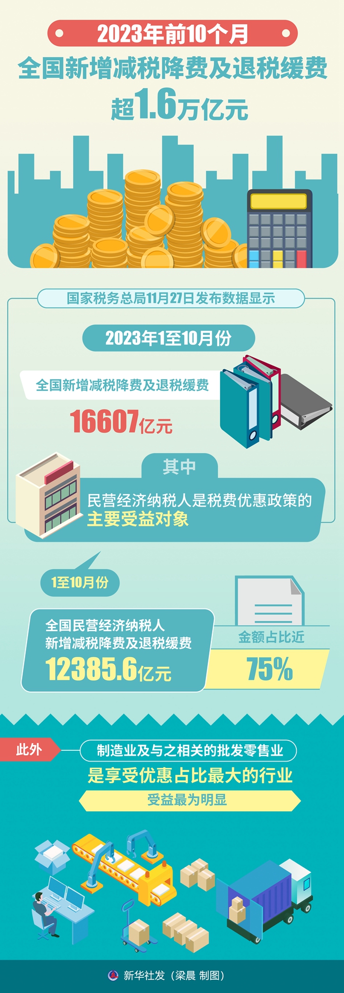 新华社北京11月27日电(记者王雨萧)国家税务总局27日发布数据显示,今年1至10月份,全国新增减税降费及退税缓费16607亿元。