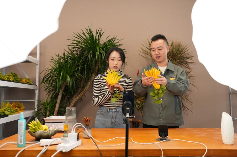 11月13日,在金华市婺城区罗店镇金佛手果园共富工坊,工作人员在直播推销佛手。新华社记者 翁忻旸 摄