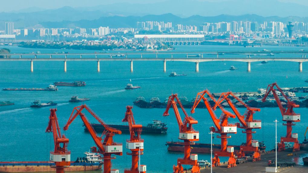 1月3日,在广西梧州临港经济区赤水港码头,工人操作设备在码头上进行装卸作业(无人机照片)。新华社发(何华文摄)
