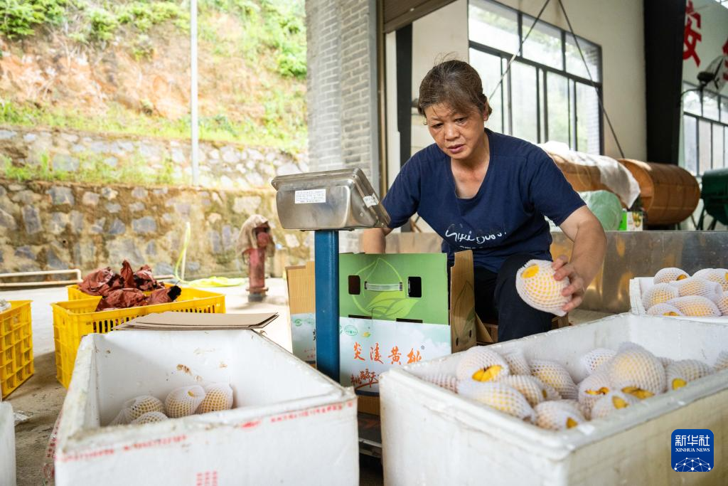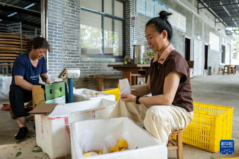 7月21日,果农在炎陵县霞阳镇石子坝村包装黄桃。新华社记者 陈思汗 摄