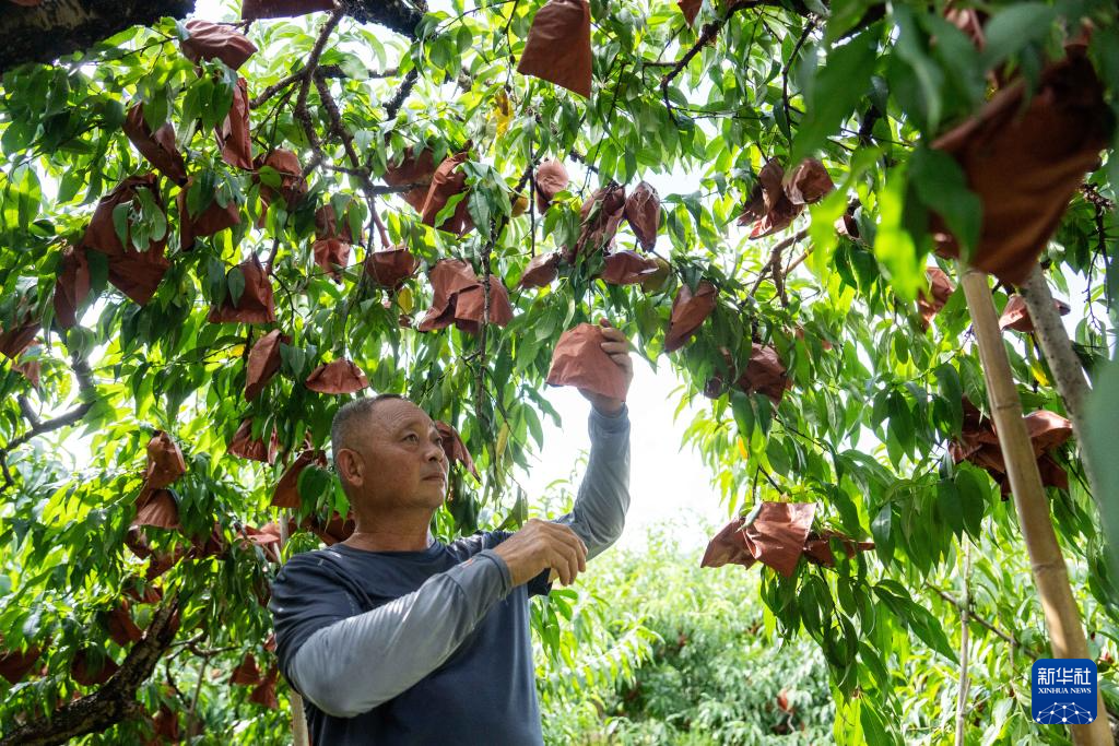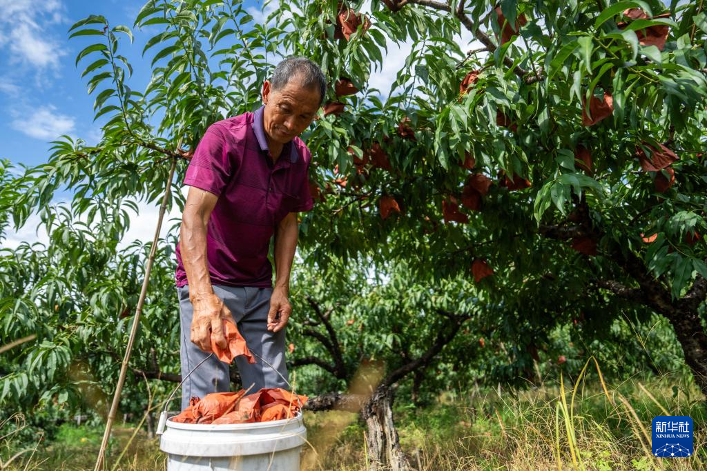 7月21日,果农在炎陵县霞阳镇石子坝村的果园里采摘黄桃。新华社记者 陈思汗 摄
