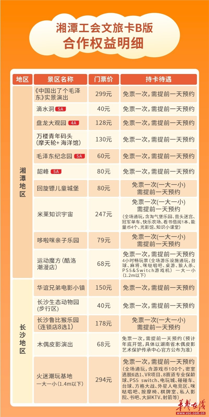 与往期不同的是,本期活动将集中发放“定向文旅券”。中签会员可获得“湘潭工会文旅票”(分A、B版,二选一),针对湘潭工会文旅票对应的景点凭票都可免费入园一次。 活动秉承公平公正原则,采用“在线报名+摇号中签”方式。只要是录入湖南省网上工会工作平台的工会会员(含新就业形态劳动者),均可参与。